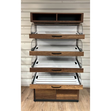 Le produit est un meuble de présentation en bois conçu pour exposer des produits alimentaires, probablement des produits de boulangerie ou de pâtisserie. Voici ses principales caractéristiques :