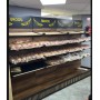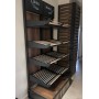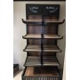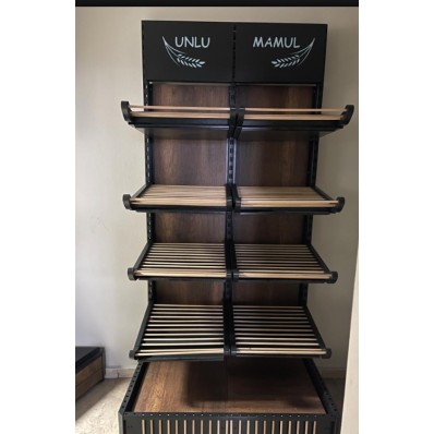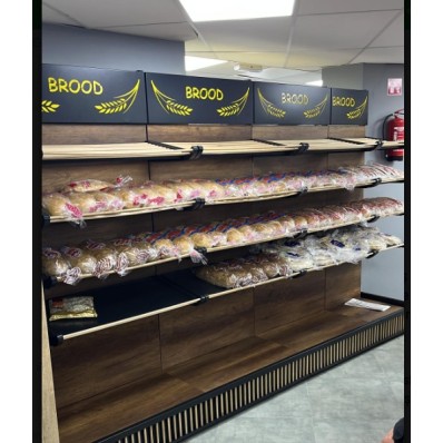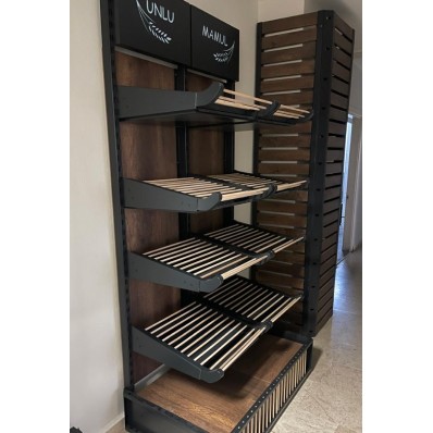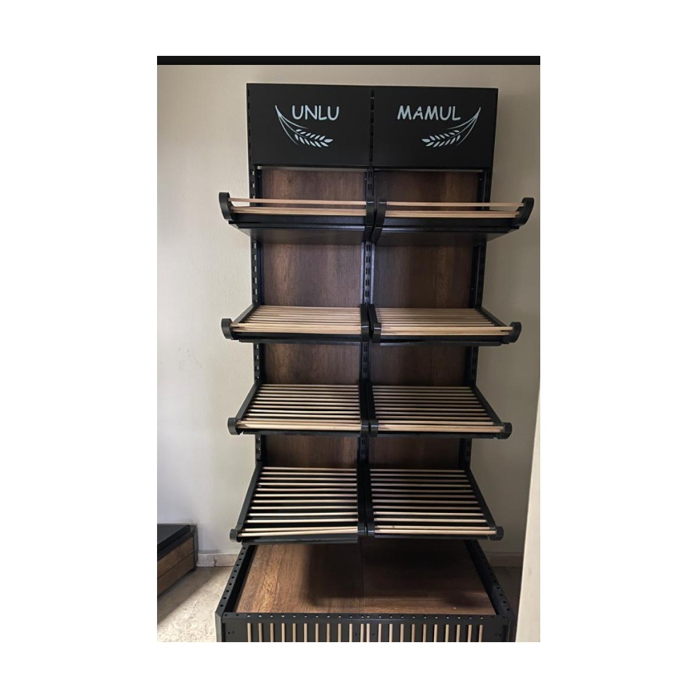 Le présentoir possède 4 niveaux d'étagères, plus une base. Les étagères sont faites de lattes de bois clair, ce qui permet une bonne circulation de l'air autour des produits exposés. La base du présentoir est pleine, avec une surface en bois foncé similaire au fond du meuble. Les côtés de la base sont décorés de petites lattes verticales. La hauteur entre chaque niveau d'étagère semble être suffisante pour accueillir une variété de produits de boulangerie de différentes tailles.