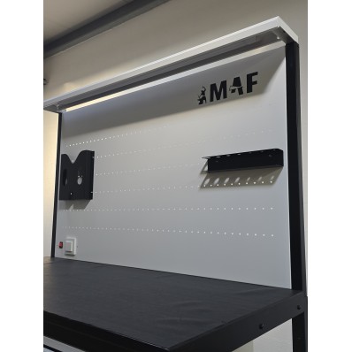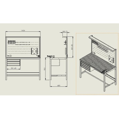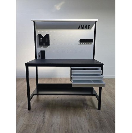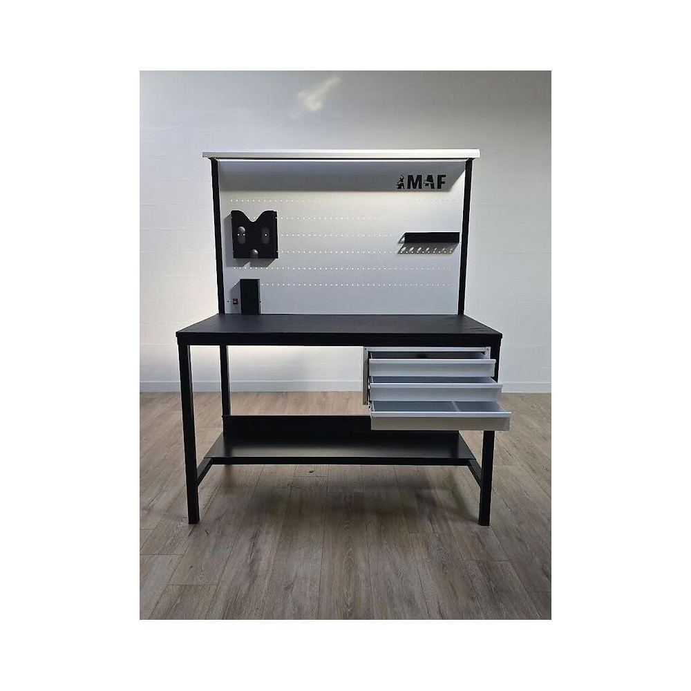 Etablis d'atelier professionnel de haute qualité, mesurant 1m40 de largeur sur 70cm de profondeur. Équipé de 4 tiroirs spacieux, d'un éclairage intégré, d'une prise électrique, et d'une protection sous prise. Un panneau perforé est inclus pour accrocher facilement vos outils. Fabriqué sur mesure selon vos besoins, cet établi est conçu pour répondre aux exigences des professionnels.