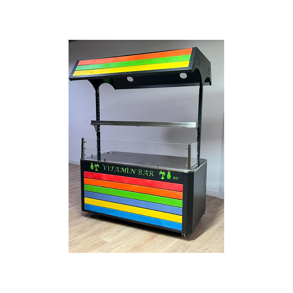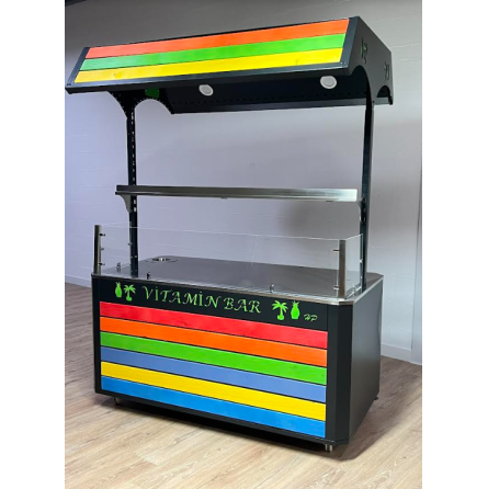 Ce bar est idéal pour les événements, les espaces commerciaux ou tout autre lieu nécessitant un service de cocktails de fruits dynamique et original. Grâce à son design coloré et sa grande praticité, le Vitamine Bar crée une ambiance festive et est un excellent moyen de stimuler l'interaction avec les clients.