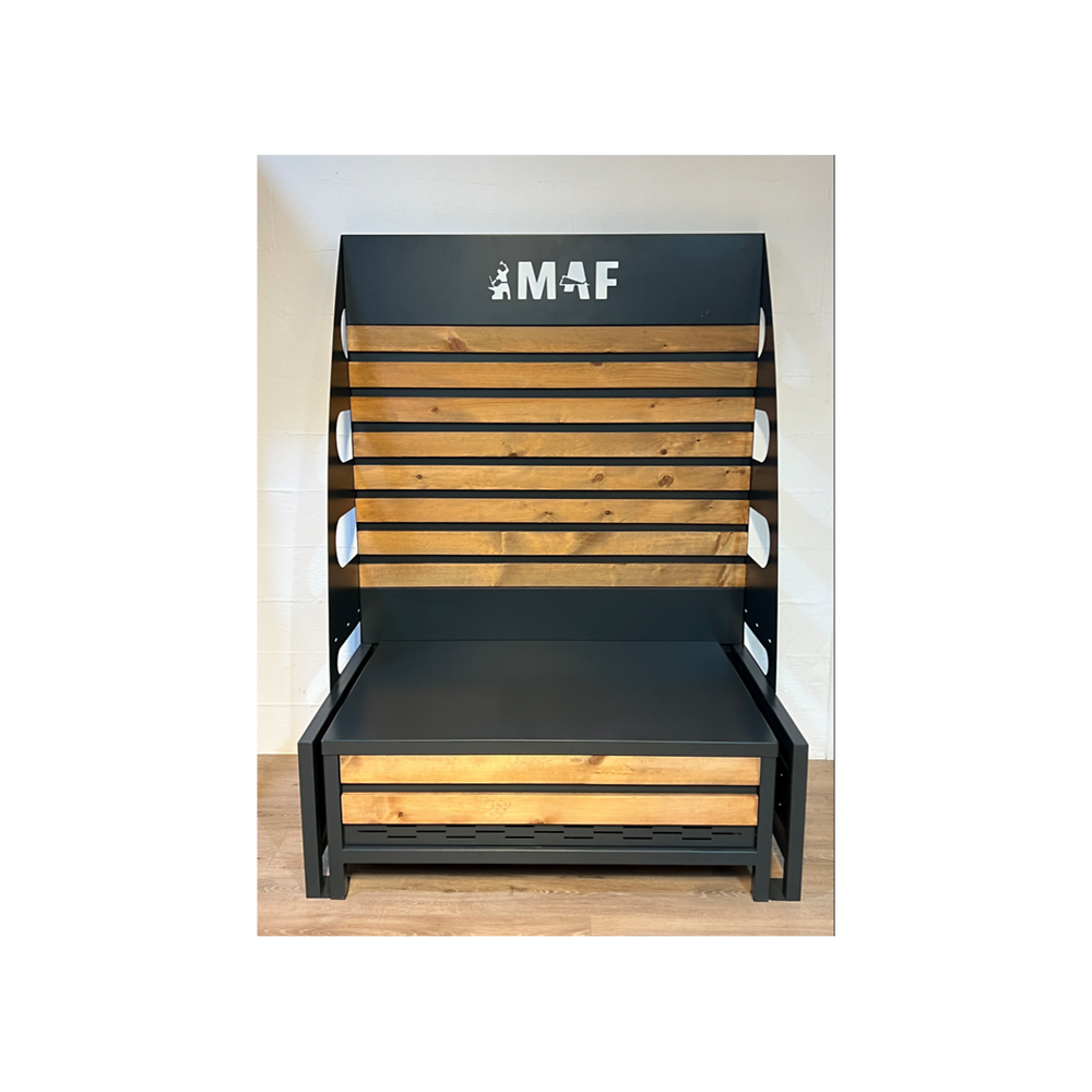 Un présentoir à féculents en acier et bois, conçu pour stocker et mettre en valeur de grands sacs de riz, pâtes, ou autres produits alimentaires en vrac. Son design robuste et élégant en fait un choix parfait pour optimiser l’espace tout en offrant une présentation pratique et esthétique.