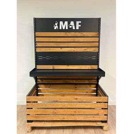 Un présentoir à palette en acier et bois, à la fois moderne et pratique, conçu pour mettre en valeur vos produits tout en optimisant l'espace de vente. Sa structure robuste et son design élégant en font un choix idéal pour toute boutique ou événement.